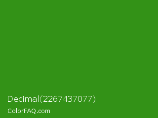 Decimal 2267437077 Color is a normal green color and the nearest color is Slimy Green #299617. Hex code #339217 and RGB value is rgb(51,146,23). In RGB color space, this color is composed of 20% red, 57% green, 9% blue, In CMYK color space, this color is composed of 65% cyan, 0% magenta, 84% yellow , 43% black , In HSL color space, this color has a hue angle of 106° , 73% saturation and 33% lightness.