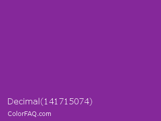 Decimal 141715074 Color is a normal purple color and the nearest color is Vivid Violet #803790. Hex code #85289a and RGB value is rgb(133,40,154). In RGB color space, this color is composed of 52% red, 16% green, 60% blue, In CMYK color space, this color is composed of 14% cyan, 74% magenta, 0% yellow , 40% black , In HSL color space, this color has a hue angle of 289° , 59% saturation and 38% lightness.