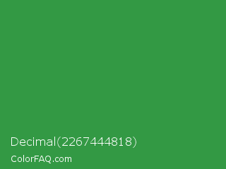 Decimal 2267444818 Color is a normal green color and the nearest color is Sea Green #2e8b57. Hex code #339944 and RGB value is rgb(51,153,68). In RGB color space, this color is composed of 20% red, 60% green, 27% blue, In CMYK color space, this color is composed of 67% cyan, 0% magenta, 56% yellow , 40% black , In HSL color space, this color has a hue angle of 130° , 50% saturation and 40% lightness.