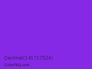 Decimal 141717524 Color is a normal violet color and the nearest color is Blue Violet #8a2be2. Hex code #8529e6 and RGB value is rgb(133,41,230). In RGB color space, this color is composed of 52% red, 16% green, 90% blue, In CMYK color space, this color is composed of 42% cyan, 82% magenta, 0% yellow , 10% black , In HSL color space, this color has a hue angle of 269° , 79% saturation and 53% lightness.