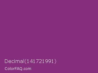 Decimal 141721991 Color is a normal magenta color and the nearest color is Razzmic Berry Crayola #843179. Hex code #852e7b and RGB value is rgb(133,46,123). In RGB color space, this color is composed of 52% red, 18% green, 48% blue, In CMYK color space, this color is composed of 0% cyan, 65% magenta, 8% yellow , 48% black , In HSL color space, this color has a hue angle of 307° , 49% saturation and 35% lightness.
