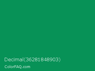Decimal 36281848903 Color is a dark green color and the nearest color is Spanish Green #009150. Hex code #079257 and RGB value is rgb(7,146,87). In RGB color space, this color is composed of 3% red, 57% green, 34% blue, In CMYK color space, this color is composed of 95% cyan, 0% magenta, 40% yellow , 43% black , In HSL color space, this color has a hue angle of 155° , 91% saturation and 30% lightness.