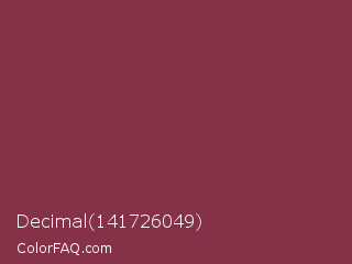Decimal 141726049 Color is a normal rose color and the nearest color is Solid Pink #893843. Hex code #853249 and RGB value is rgb(133,50,73). In RGB color space, this color is composed of 52% red, 20% green, 29% blue, In CMYK color space, this color is composed of 0% cyan, 62% magenta, 45% yellow , 48% black , In HSL color space, this color has a hue angle of 343° , 45% saturation and 36% lightness.