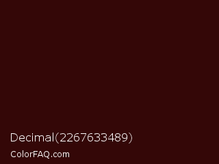 Decimal 2267633489 Color is a very dark red color and the nearest color is Chocolate #370202. Hex code #340707 and RGB value is rgb(52,7,7). In RGB color space, this color is composed of 20% red, 3% green, 3% blue, In CMYK color space, this color is composed of 0% cyan, 87% magenta, 87% yellow , 80% black , In HSL color space, this color has a hue angle of 0° , 76% saturation and 12% lightness.