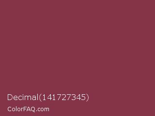 Decimal 141727345 Color is a normal red color and the nearest color is Solid Pink #893843. Hex code #853447 and RGB value is rgb(133,52,71). In RGB color space, this color is composed of 52% red, 20% green, 28% blue, In CMYK color space, this color is composed of 0% cyan, 61% magenta, 47% yellow , 48% black , In HSL color space, this color has a hue angle of 346° , 44% saturation and 36% lightness.