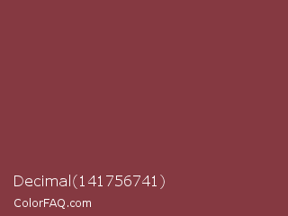 Decimal 141756741 Color is a normal red color and the nearest color is Solid Pink #893843. Hex code #853941 and RGB value is rgb(133,57,65). In RGB color space, this color is composed of 52% red, 22% green, 25% blue, In CMYK color space, this color is composed of 0% cyan, 57% magenta, 51% yellow , 48% black , In HSL color space, this color has a hue angle of 354° , 40% saturation and 37% lightness.