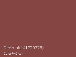 Decimal 141770775 Color is a normal red color and the nearest color is Ironstone #86483c. Hex code #854541 and RGB value is rgb(133,69,65). In RGB color space, this color is composed of 52% red, 27% green, 25% blue, In CMYK color space, this color is composed of 0% cyan, 48% magenta, 51% yellow , 48% black , In HSL color space, this color has a hue angle of 4° , 34% saturation and 39% lightness.