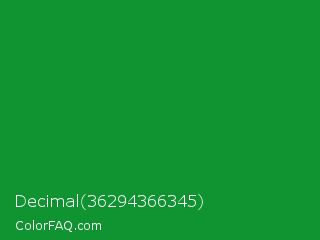 Decimal 36294366345 Color is a normal green color and the nearest color is North Texas Green #059033. Hex code #109331 and RGB value is rgb(16,147,49). In RGB color space, this color is composed of 6% red, 58% green, 19% blue, In CMYK color space, this color is composed of 89% cyan, 0% magenta, 67% yellow , 42% black , In HSL color space, this color has a hue angle of 135° , 80% saturation and 32% lightness.