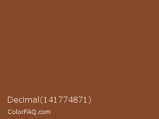 Decimal 141774871 Color is a normal orange color and the nearest color is Nutmeg #81422c. Hex code #854929 and RGB value is rgb(133,73,41). In RGB color space, this color is composed of 52% red, 29% green, 16% blue, In CMYK color space, this color is composed of 0% cyan, 45% magenta, 69% yellow , 48% black , In HSL color space, this color has a hue angle of 21° , 53% saturation and 34% lightness.