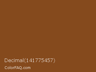 Decimal 141775457 Color is a normal orange color and the nearest color is Bull Shot #864d1e. Hex code #854a1d and RGB value is rgb(133,74,29). In RGB color space, this color is composed of 52% red, 29% green, 11% blue, In CMYK color space, this color is composed of 0% cyan, 44% magenta, 78% yellow , 48% black , In HSL color space, this color has a hue angle of 26° , 64% saturation and 32% lightness.