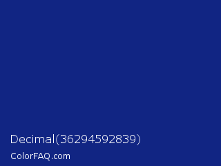 Decimal 36294592839 Color is a dark blue color and the nearest color is Catalina Blue #062a78. Hex code #112583 and RGB value is rgb(17,37,131). In RGB color space, this color is composed of 7% red, 15% green, 51% blue, In CMYK color space, this color is composed of 87% cyan, 72% magenta, 0% yellow , 49% black , In HSL color space, this color has a hue angle of 229° , 77% saturation and 29% lightness.