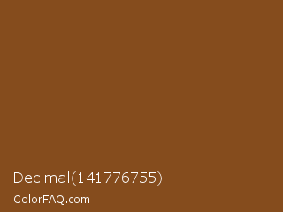 Decimal 141776755 Color is a normal orange color and the nearest color is Bull Shot #864d1e. Hex code #854c1d and RGB value is rgb(133,76,29). In RGB color space, this color is composed of 52% red, 30% green, 11% blue, In CMYK color space, this color is composed of 0% cyan, 43% magenta, 78% yellow , 48% black , In HSL color space, this color has a hue angle of 27° , 64% saturation and 32% lightness.