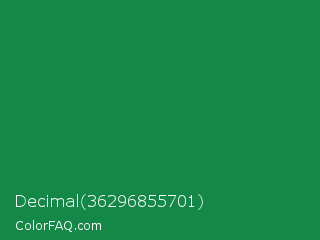 Decimal 36296855701 Color is a normal green color and the nearest color is Salem #097f4b. Hex code #148947 and RGB value is rgb(20,137,71). In RGB color space, this color is composed of 8% red, 54% green, 28% blue, In CMYK color space, this color is composed of 85% cyan, 0% magenta, 48% yellow , 46% black , In HSL color space, this color has a hue angle of 146° , 75% saturation and 31% lightness.