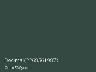 Decimal 2268561987 Color is a dark green color and the nearest color is Cape Cod #3c4443. Hex code #354943 and RGB value is rgb(53,73,67). In RGB color space, this color is composed of 21% red, 29% green, 26% blue, In CMYK color space, this color is composed of 27% cyan, 0% magenta, 8% yellow , 71% black , In HSL color space, this color has a hue angle of 162° , 16% saturation and 25% lightness.
