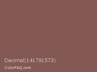 Decimal 141791573 Color is a normal red color and the nearest color is Spicy Mix #8b5f4d. Hex code #855953 and RGB value is rgb(133,89,83). In RGB color space, this color is composed of 52% red, 35% green, 33% blue, In CMYK color space, this color is composed of 0% cyan, 33% magenta, 38% yellow , 48% black , In HSL color space, this color has a hue angle of 7° , 23% saturation and 42% lightness.