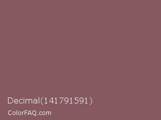 Decimal 141791591 Color is a normal red color and the nearest color is Deep Taupe #7e5e60. Hex code #85595f and RGB value is rgb(133,89,95). In RGB color space, this color is composed of 52% red, 35% green, 37% blue, In CMYK color space, this color is composed of 0% cyan, 33% magenta, 29% yellow , 48% black , In HSL color space, this color has a hue angle of 352° , 20% saturation and 44% lightness.