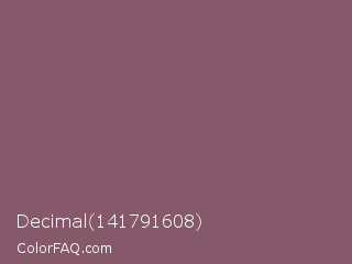 Decimal 141791608 Color is a normal rose color and the nearest color is Falcon #7f626d. Hex code #85596a and RGB value is rgb(133,89,106). In RGB color space, this color is composed of 52% red, 35% green, 42% blue, In CMYK color space, this color is composed of 0% cyan, 33% magenta, 20% yellow , 48% black , In HSL color space, this color has a hue angle of 337° , 20% saturation and 44% lightness.
