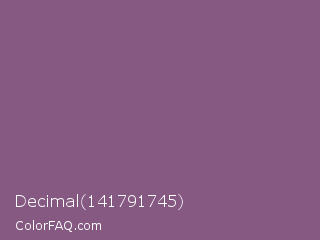 Decimal 141791745 Color is a normal magenta color and the nearest color is Chinese Violet #856088. Hex code #855981 and RGB value is rgb(133,89,129). In RGB color space, this color is composed of 52% red, 35% green, 51% blue, In CMYK color space, this color is composed of 0% cyan, 33% magenta, 3% yellow , 48% black , In HSL color space, this color has a hue angle of 305° , 20% saturation and 44% lightness.