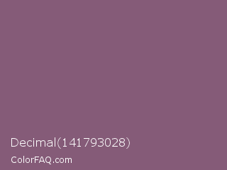 Decimal 141793028 Color is a normal magenta color and the nearest color is Falcon #7f626d. Hex code #855b78 and RGB value is rgb(133,91,120). In RGB color space, this color is composed of 52% red, 36% green, 47% blue, In CMYK color space, this color is composed of 0% cyan, 32% magenta, 10% yellow , 48% black , In HSL color space, this color has a hue angle of 319° , 19% saturation and 44% lightness.
