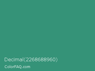 Decimal 2268688960 Color is a normal green color and the nearest color is Illuminating Emerald #319177. Hex code #359378 and RGB value is rgb(53,147,120). In RGB color space, this color is composed of 21% red, 58% green, 47% blue, In CMYK color space, this color is composed of 64% cyan, 0% magenta, 18% yellow , 42% black , In HSL color space, this color has a hue angle of 163° , 47% saturation and 39% lightness.