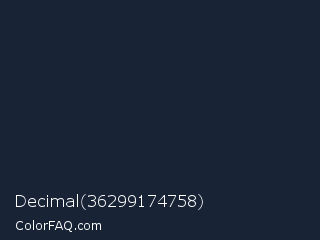 Decimal 36299174758 Color is a very dark blue color and the nearest color is Big Stone #162a40. Hex code #182436 and RGB value is rgb(24,36,54). In RGB color space, this color is composed of 9% red, 14% green, 21% blue, In CMYK color space, this color is composed of 56% cyan, 33% magenta, 0% yellow , 79% black , In HSL color space, this color has a hue angle of 216° , 38% saturation and 15% lightness.