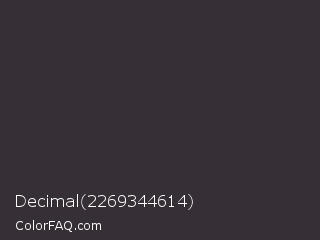 Decimal 2269344614 Color is a very dark magenta color and the nearest color is Jet #343434. Hex code #363036 and RGB value is rgb(54,48,54). In RGB color space, this color is composed of 21% red, 19% green, 21% blue, In CMYK color space, this color is composed of 0% cyan, 11% magenta, 0% yellow , 79% black , In HSL color space, this color has a hue angle of 300° , 6% saturation and 20% lightness.