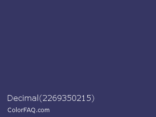 Decimal 2269350215 Color is a dark blue color and the nearest color is Deep Koamaru #333366. Hex code #363663 and RGB value is rgb(54,54,99). In RGB color space, this color is composed of 21% red, 21% green, 39% blue, In CMYK color space, this color is composed of 45% cyan, 45% magenta, 0% yellow , 61% black , In HSL color space, this color has a hue angle of 240° , 29% saturation and 30% lightness.