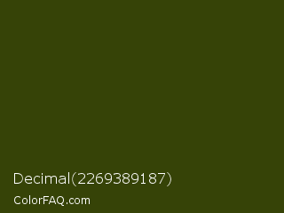 Decimal 2269389187 Color is a very dark lime color and the nearest color is Waiouru #363c0d. Hex code #364307 and RGB value is rgb(54,67,7). In RGB color space, this color is composed of 21% red, 26% green, 3% blue, In CMYK color space, this color is composed of 19% cyan, 0% magenta, 90% yellow , 74% black , In HSL color space, this color has a hue angle of 73° , 81% saturation and 15% lightness.