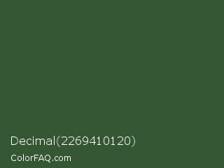 Decimal 2269410120 Color is a dark green color and the nearest color is Hunter Green #355e3b. Hex code #365734 and RGB value is rgb(54,87,52). In RGB color space, this color is composed of 21% red, 34% green, 20% blue, In CMYK color space, this color is composed of 38% cyan, 0% magenta, 40% yellow , 66% black , In HSL color space, this color has a hue angle of 117° , 25% saturation and 27% lightness.