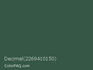 Decimal 2269410150 Color is a dark green color and the nearest color is Hunter Green #355e3b. Hex code #365746 and RGB value is rgb(54,87,70). In RGB color space, this color is composed of 21% red, 34% green, 27% blue, In CMYK color space, this color is composed of 38% cyan, 0% magenta, 20% yellow , 66% black , In HSL color space, this color has a hue angle of 149° , 23% saturation and 28% lightness.
