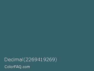 Decimal 2269419269 Color is a normal cyan color and the nearest color is Casal #2f6168. Hex code #366069 and RGB value is rgb(54,96,105). In RGB color space, this color is composed of 21% red, 38% green, 41% blue, In CMYK color space, this color is composed of 49% cyan, 9% magenta, 0% yellow , 59% black , In HSL color space, this color has a hue angle of 191° , 32% saturation and 31% lightness.