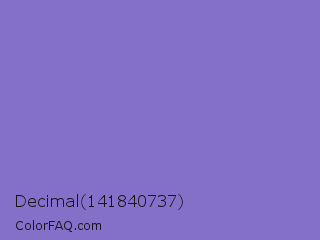 Decimal 141840737 Color is a light indigo color and the nearest color is Ube #8878c3. Hex code #8570c9 and RGB value is rgb(133,112,201). In RGB color space, this color is composed of 52% red, 44% green, 79% blue, In CMYK color space, this color is composed of 34% cyan, 44% magenta, 0% yellow , 21% black , In HSL color space, this color has a hue angle of 254° , 45% saturation and 61% lightness.