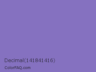 Decimal 141841416 Color is a normal indigo color and the nearest color is Middle Blue Purple #8b72be. Hex code #8571c0 and RGB value is rgb(133,113,192). In RGB color space, this color is composed of 52% red, 44% green, 75% blue, In CMYK color space, this color is composed of 31% cyan, 41% magenta, 0% yellow , 25% black , In HSL color space, this color has a hue angle of 255° , 39% saturation and 60% lightness.
