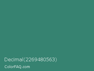 Decimal 2269480563 Color is a normal cyan color and the nearest color is Viridian #40826d. Hex code #368371 and RGB value is rgb(54,131,113). In RGB color space, this color is composed of 21% red, 51% green, 44% blue, In CMYK color space, this color is composed of 59% cyan, 0% magenta, 14% yellow , 49% black , In HSL color space, this color has a hue angle of 166° , 42% saturation and 36% lightness.