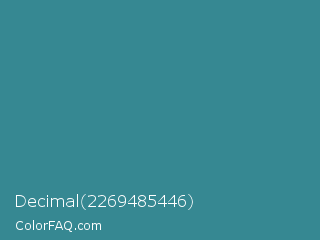 Decimal 2269485446 Color is a normal cyan color and the nearest color is Lochinvar #2c8c84. Hex code #368892 and RGB value is rgb(54,136,146). In RGB color space, this color is composed of 21% red, 53% green, 57% blue, In CMYK color space, this color is composed of 63% cyan, 7% magenta, 0% yellow , 43% black , In HSL color space, this color has a hue angle of 187° , 46% saturation and 39% lightness.