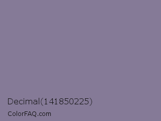 Decimal 141850225 Color is a normal violet color and the nearest color is Waterloo #7b7c94. Hex code #857a97 and RGB value is rgb(133,122,151). In RGB color space, this color is composed of 52% red, 48% green, 59% blue, In CMYK color space, this color is composed of 12% cyan, 19% magenta, 0% yellow , 41% black , In HSL color space, this color has a hue angle of 263° , 12% saturation and 54% lightness.