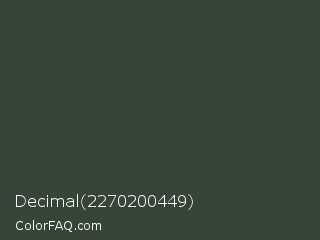 Decimal 2270200449 Color is a dark green color and the nearest color is Lunar Green #3c493a. Hex code #374539 and RGB value is rgb(55,69,57). In RGB color space, this color is composed of 22% red, 27% green, 22% blue, In CMYK color space, this color is composed of 20% cyan, 0% magenta, 17% yellow , 73% black , In HSL color space, this color has a hue angle of 129° , 11% saturation and 24% lightness.