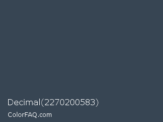 Decimal 2270200583 Color is a dark blue color and the nearest color is Oxford Blue #384555. Hex code #374553 and RGB value is rgb(55,69,83). In RGB color space, this color is composed of 22% red, 27% green, 33% blue, In CMYK color space, this color is composed of 34% cyan, 17% magenta, 0% yellow , 67% black , In HSL color space, this color has a hue angle of 210° , 20% saturation and 27% lightness.