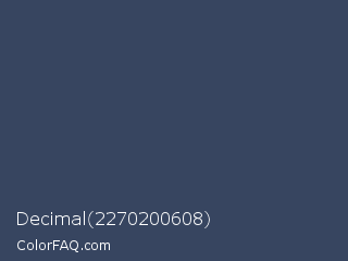 Decimal 2270200608 Color is a dark blue color and the nearest color is Pickled Bluewood #314459. Hex code #374560 and RGB value is rgb(55,69,96). In RGB color space, this color is composed of 22% red, 27% green, 38% blue, In CMYK color space, this color is composed of 43% cyan, 28% magenta, 0% yellow , 62% black , In HSL color space, this color has a hue angle of 220° , 27% saturation and 30% lightness.