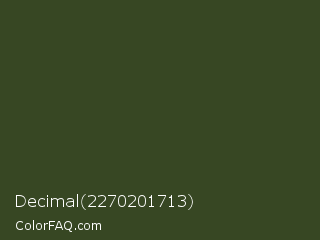 Decimal 2270201713 Color is a very dark green color and the nearest color is Kombu Green #354230. Hex code #374723 and RGB value is rgb(55,71,35). In RGB color space, this color is composed of 22% red, 28% green, 14% blue, In CMYK color space, this color is composed of 23% cyan, 0% magenta, 51% yellow , 72% black , In HSL color space, this color has a hue angle of 87° , 34% saturation and 21% lightness.