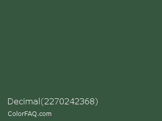 Decimal 2270242368 Color is a dark green color and the nearest color is Hunter Green #355e3b. Hex code #375640 and RGB value is rgb(55,86,64). In RGB color space, this color is composed of 22% red, 34% green, 25% blue, In CMYK color space, this color is composed of 36% cyan, 0% magenta, 26% yellow , 66% black , In HSL color space, this color has a hue angle of 137° , 22% saturation and 28% lightness.