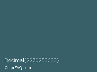 Decimal 2270253633 Color is a normal cyan color and the nearest color is Casal #2f6168. Hex code #376069 and RGB value is rgb(55,96,105). In RGB color space, this color is composed of 22% red, 38% green, 41% blue, In CMYK color space, this color is composed of 48% cyan, 9% magenta, 0% yellow , 59% black , In HSL color space, this color has a hue angle of 191° , 31% saturation and 31% lightness.