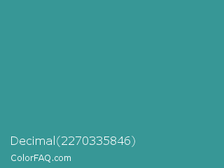 Decimal 2270335846 Color is a normal cyan color and the nearest color is Zomp #39a78e. Hex code #379796 and RGB value is rgb(55,151,150). In RGB color space, this color is composed of 22% red, 59% green, 59% blue, In CMYK color space, this color is composed of 64% cyan, 0% magenta, 1% yellow , 41% black , In HSL color space, this color has a hue angle of 179° , 47% saturation and 40% lightness.