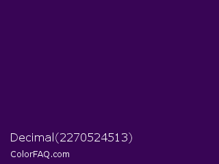 Decimal 2270524513 Color is a very dark purple color and the nearest color is Jagger #350e57. Hex code #380555 and RGB value is rgb(56,5,85). In RGB color space, this color is composed of 22% red, 2% green, 33% blue, In CMYK color space, this color is composed of 34% cyan, 94% magenta, 0% yellow , 67% black , In HSL color space, this color has a hue angle of 278° , 89% saturation and 18% lightness.
