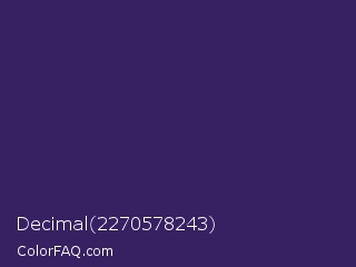 Decimal 2270578243 Color is a dark violet color and the nearest color is Jacarta #3a2a6a. Hex code #382163 and RGB value is rgb(56,33,99). In RGB color space, this color is composed of 22% red, 13% green, 39% blue, In CMYK color space, this color is composed of 43% cyan, 67% magenta, 0% yellow , 61% black , In HSL color space, this color has a hue angle of 261° , 50% saturation and 26% lightness.