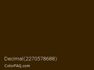 Decimal 2270578688 Color is a very dark orange color and the nearest color is Dark Ebony #3c2005. Hex code #382200 and RGB value is rgb(56,34,0). In RGB color space, this color is composed of 22% red, 13% green, 0% blue, In CMYK color space, this color is composed of 0% cyan, 39% magenta, 100% yellow , 78% black , In HSL color space, this color has a hue angle of 36° , 100% saturation and 11% lightness.