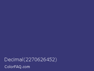 Decimal 2270626452 Color is a normal indigo color and the nearest color is Minsk #3f307f. Hex code #383776 and RGB value is rgb(56,55,118). In RGB color space, this color is composed of 22% red, 22% green, 46% blue, In CMYK color space, this color is composed of 53% cyan, 53% magenta, 0% yellow , 54% black , In HSL color space, this color has a hue angle of 241° , 36% saturation and 34% lightness.