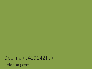 Decimal 141914211 Color is a normal lime color and the nearest color is Sushi #87ab39. Hex code #859f47 and RGB value is rgb(133,159,71). In RGB color space, this color is composed of 52% red, 62% green, 28% blue, In CMYK color space, this color is composed of 16% cyan, 0% magenta, 55% yellow , 38% black , In HSL color space, this color has a hue angle of 78° , 38% saturation and 45% lightness.