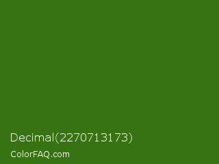 Decimal 2270713173 Color is a dark green color and the nearest color is Bilbao #327c14. Hex code #387313 and RGB value is rgb(56,115,19). In RGB color space, this color is composed of 22% red, 45% green, 7% blue, In CMYK color space, this color is composed of 51% cyan, 0% magenta, 83% yellow , 55% black , In HSL color space, this color has a hue angle of 97° , 72% saturation and 26% lightness.
