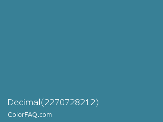 Decimal 2270728212 Color is a normal blue color and the nearest color is Astral #327da0. Hex code #388096 and RGB value is rgb(56,128,150). In RGB color space, this color is composed of 22% red, 50% green, 59% blue, In CMYK color space, this color is composed of 63% cyan, 15% magenta, 0% yellow , 41% black , In HSL color space, this color has a hue angle of 194° , 46% saturation and 40% lightness.
